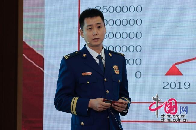 天津消防账号负责人、天津市消防救援总队新闻宣传处副处长佟欣发表演讲。中国网 董宁 摄