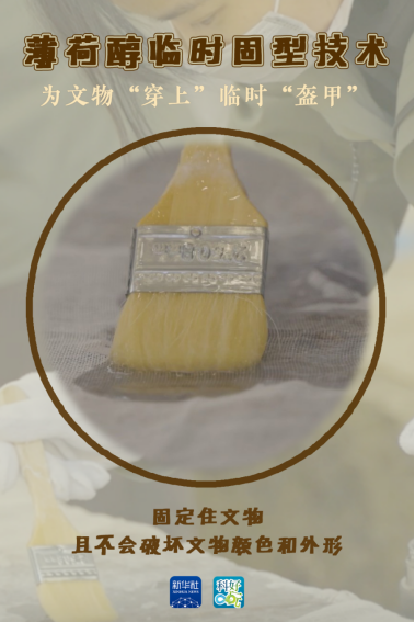 薄荷醇,就是我们风油精、牙膏里常见的“薄荷脑”。它是由薄荷的茎叶经过水蒸气蒸馏所得的自然精油,冷却后形成固形物,正好可用于文物固定。同时薄荷醇易挥发,这是文物保护迫切需要的,它不会对文物颜色和外形产生破坏作用,易于去除。这项由上海大学教授罗宏杰率领团队研发的技术还应用在出土兵马俑的保护上。