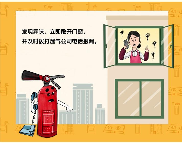 如果发生燃气泄漏的话,第一时间要做的就是切断气源,保证我们的场所是开窗通风的状态,所以同时不能轻易地去触碰这个场所内的一些电器开关,同时也不能使用打火机进行明火的燃气的泄漏检查,同时也要及时地去通知燃气公司以及物业服务企业,这里面需要特别提示的一点,就是我们在拨打电话或者接听电话的时候,需要撤离到一些空旷通风的地带再进行操作。最后如果发生一些火灾或者是爆炸事故的话,及时拨打119通知消防部门进行处置。