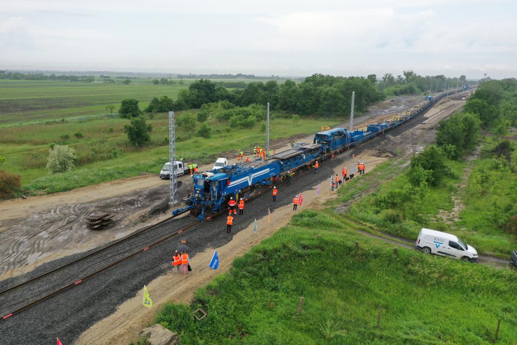 2023年5月30日,匈塞铁路匈牙利段孔圣米克洛什-陶什站至伯斯特尔站区间首对钢轨开始铺设。图为当天孔圣米克洛什-陶什站施工现场(无人机照片)。新华社发(中国中铁匈塞铁路项目经理部供图)
