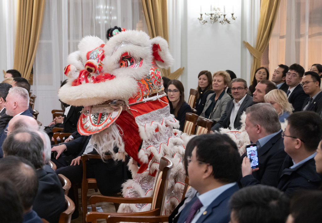 2023年11月20日,匈牙利罗兰大学中文系成立100周年庆典在匈首都布达佩斯举行,中匈各界百余名代表参加。图为庆典上拍摄的舞狮表演。新华社发(弗尔季·奥蒂洛摄)