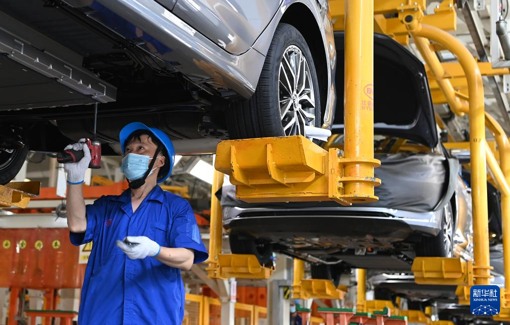 2022年4月20日,工作人员在陕西西安比亚迪草堂工业园汽车总装厂进行新能源汽车装配。新华社记者 刘潇 摄