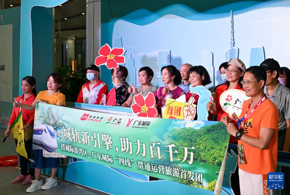 5月26日,广东城际“四线”贯通运营旅游首发团在城际铁路番禺站合影留念。新华社记者 刘大伟 摄