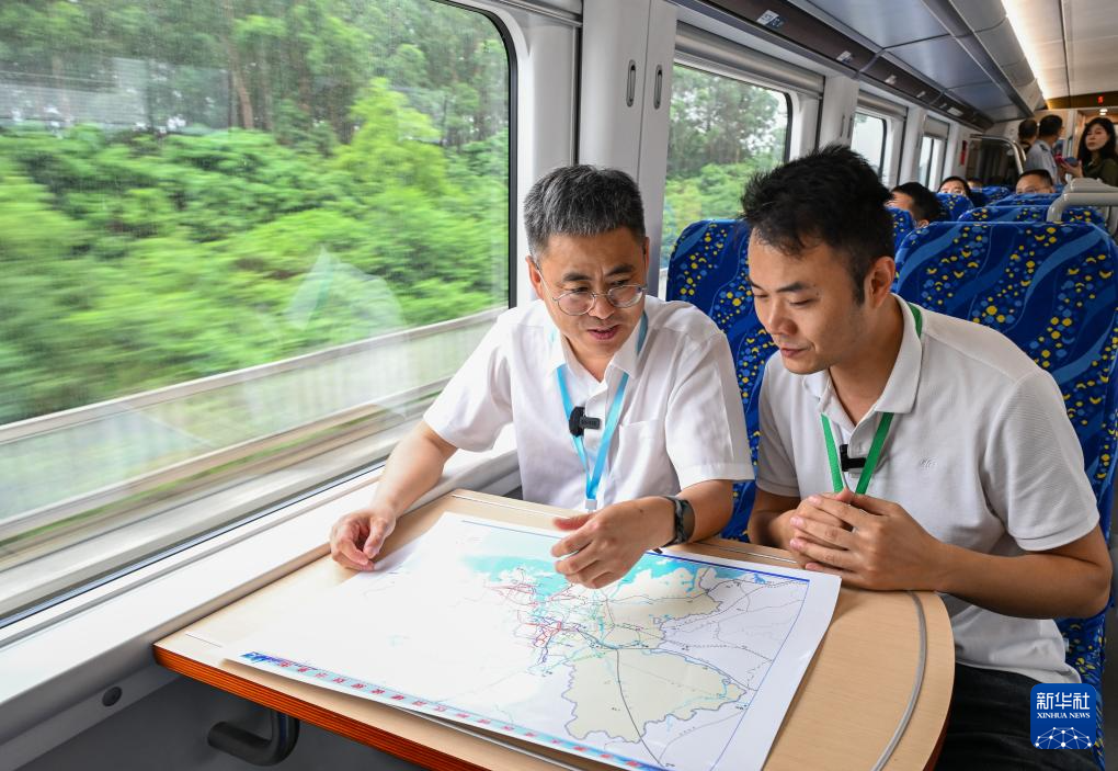 5月26日,中铁第一勘察设计院集团有限公司广佛南环总设计师韩振江(左)介绍刚刚投入运营的广佛南环、佛莞城际铁路的设计思路。新华社记者 刘大伟 摄