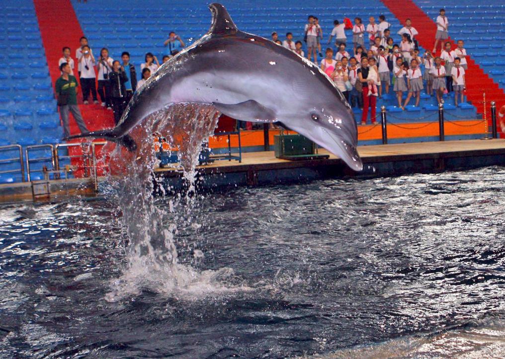 2011年5月28日,西安市500多名外来务工人员子女在西安曲江海洋极地公园观看海豚表演。