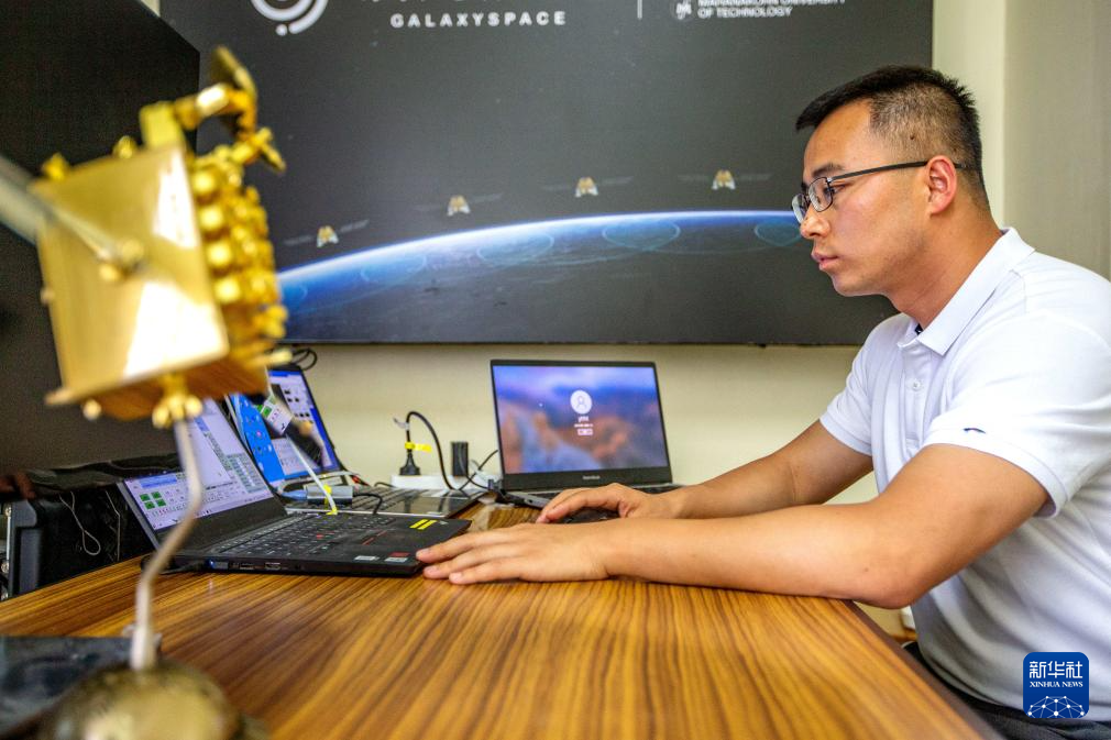 5月17日,在泰国马汉科理工大学,银河航天国际业务拓展总监黄和平检查低轨通信网络运行状态。新华社记者 王腾 摄