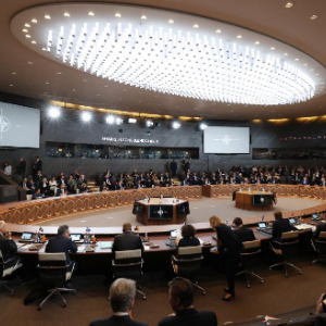 这是6月14日在比利时布鲁塞尔北约总部拍摄的北约防长会现场。北约秘书长斯托尔滕贝格14日说,北约成员国国防部长当天批准了一项旨在由北约协调对乌克兰军事援助和训练的计划。北约防长会13日至14日在布鲁塞尔举行。新华社记者赵丁喆摄