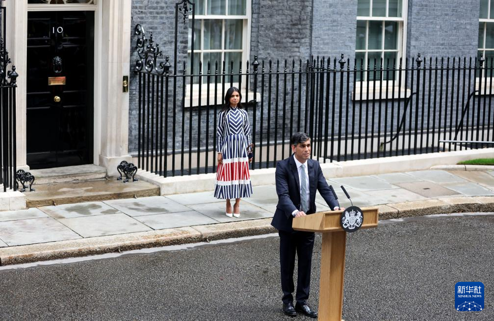 7月5日,苏纳克在英国伦敦唐宁街10号首相府前发表讲话后与夫人一同离开。新华社记者 李颖 摄