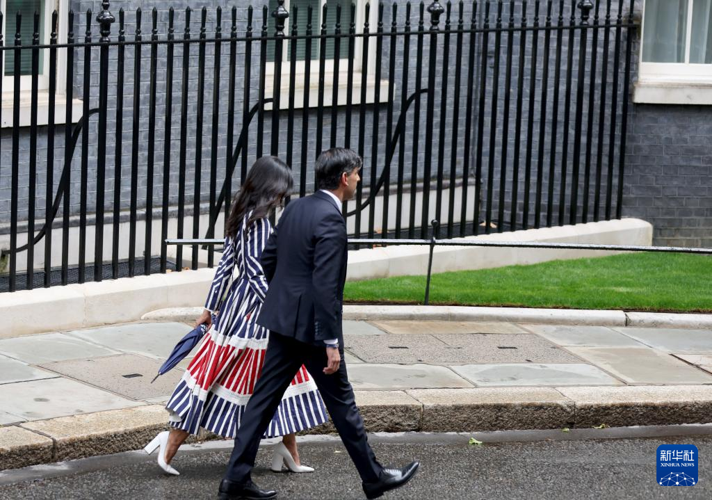 7月5日,苏纳克和夫人走出英国伦敦唐宁街10号首相府。新华社记者 李颖 摄