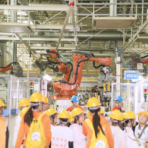 今年6月,辽宁鞍山市青葵研学营学生们在杭州市吉利汽车工厂参观。(方尚仪 摄)