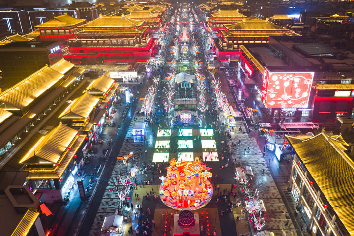 西安大唐不夜城景区景色(2024年2月2日摄,无人机照片)。新华社记者 邵瑞 摄