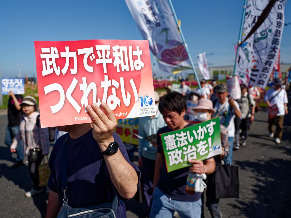 2024年5月3日,3万余名日本民众聚集在东京有明防灾公园的广场上,高喊“守护宪法、守护和平”的口号,举行了声势浩大的护宪集会。新华社记者张笑宇摄