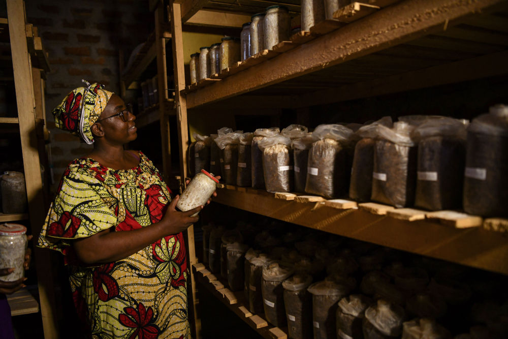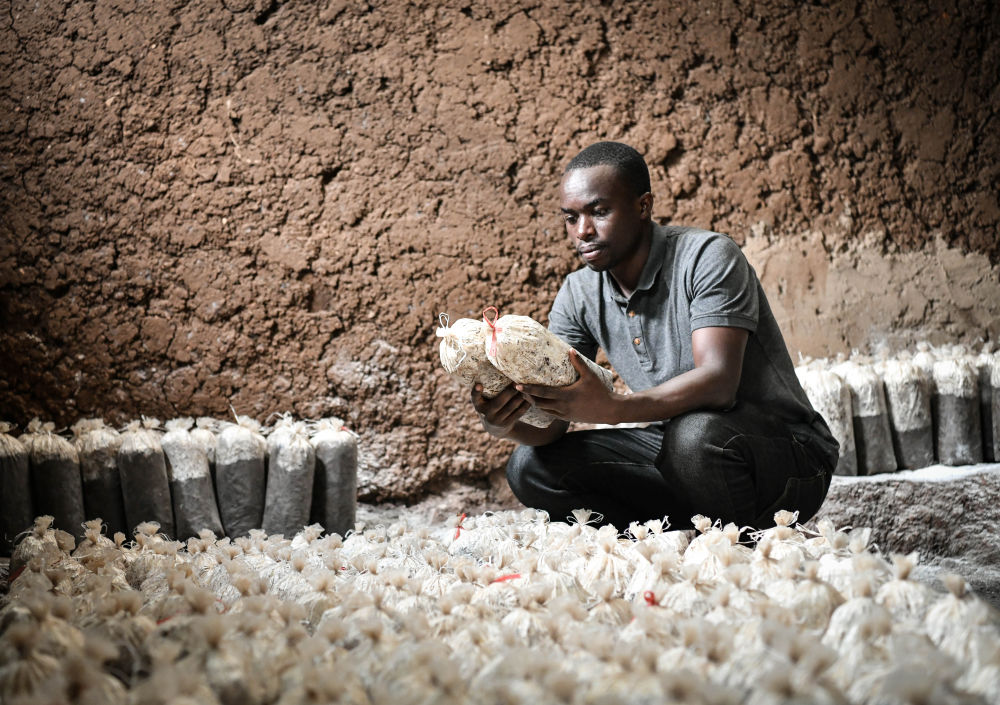 ↑尼扬博·奥贝德在卢旺达南方省的食用菌培育工坊内检查菌袋。