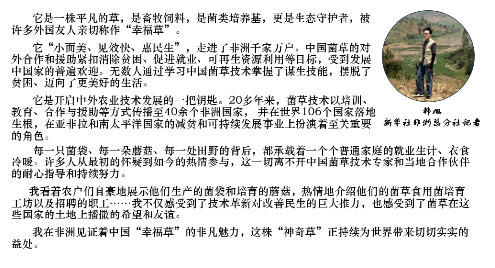 如今,菌草技术以培训、教育、合作与援助等方式在40余个非洲国家落地生根,持续在这片土地上播撒希望和友谊。菌草不仅仅是“致富草”“幸福草”,更是连结中非的友谊草。