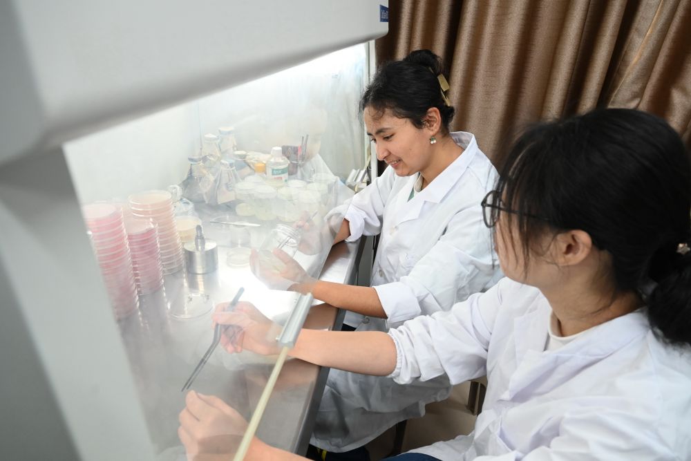 ↑福建农林大学学生古丽则巴·尼牙孜(左)和同学在福建农林大学国家菌草工程技术研究中心进行巨菌草的脱毒苗组培工作。