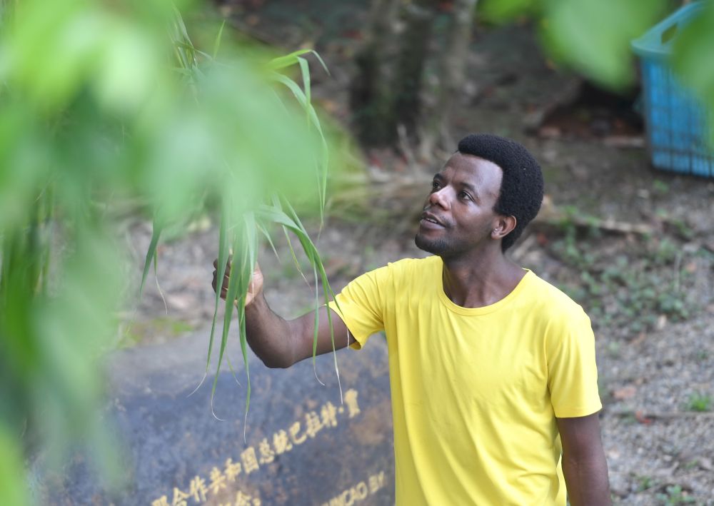 ↑卢旺达留学生欧贝德·尼伊姆巴巴兹在位于福州的福建农林大学观察巨菌草的生长情况。