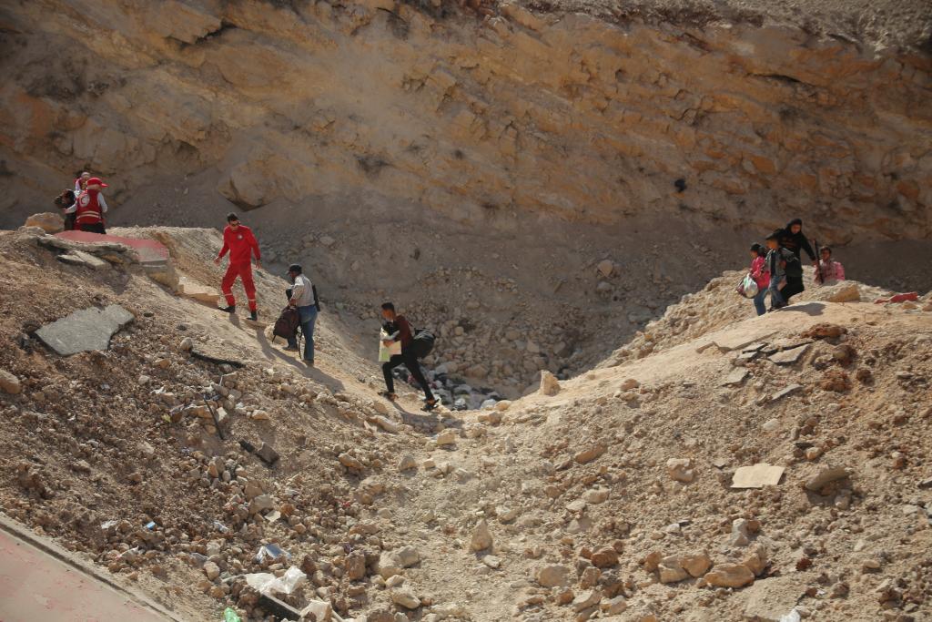 记者在现场看到,从黎巴嫩方向来的逃难者不得不下车,搬起沉重的行囊徒步穿越大坑,然后在大坑另一侧乘坐叙利亚红新月会安排的免费大巴,或提前联系好的车辆前往叙利亚一侧的边境口岸。