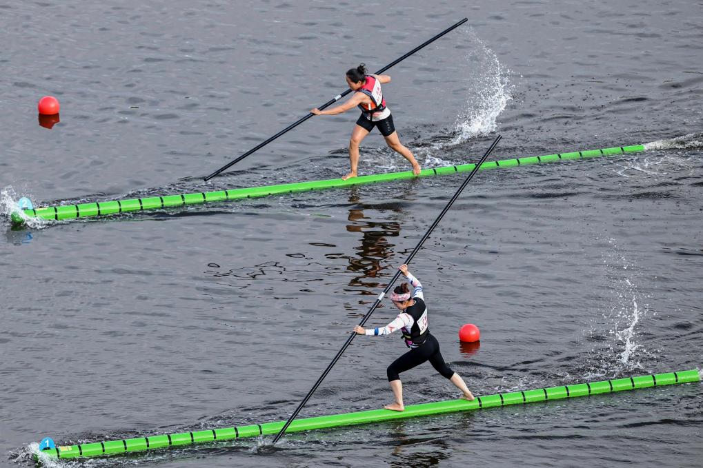 11月27日,广西队选手陆春桃(下)与云南队选手李梅芬在比赛中。当日,第十二届全国少数民族传统体育运动会女子组(独竹漂)100米直道赛在海南省三亚市举行。新华社记者 曹祎铭 摄