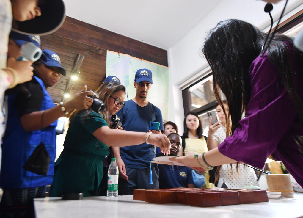 2024年9月3日,在湖南省常德市河街,外国游客体验非遗麻质画制作,感受中华传统文化的独特魅力。新华社记者 赵众志 摄