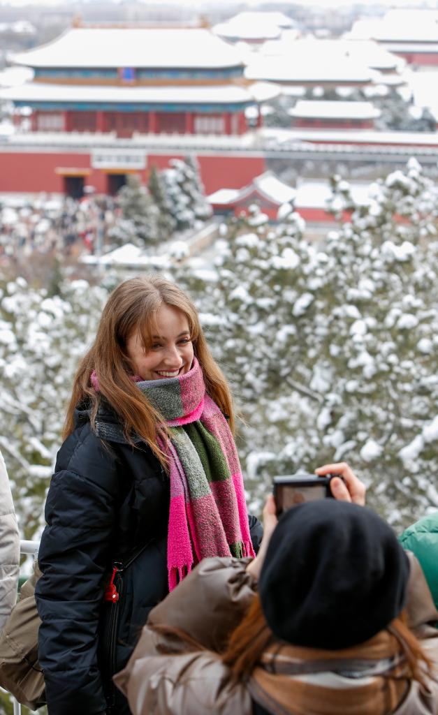 2024年2月21日,一名外国游客在景山公园和故宫留影。新华社记者 陈朔 摄