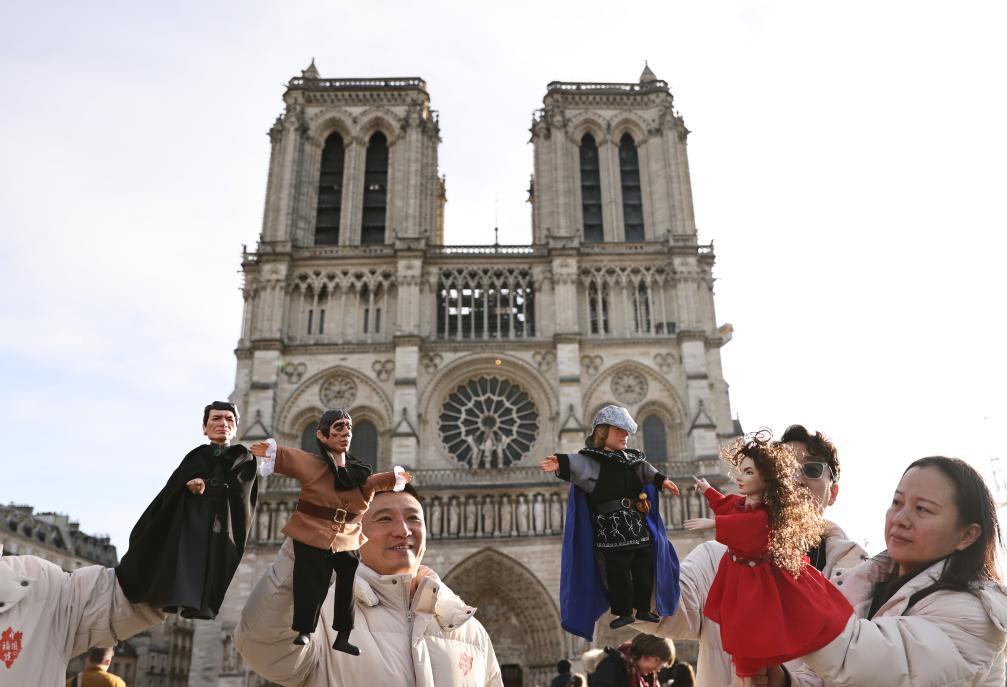 12月15日,在法国巴黎圣母院前,来自中国福建展演团的演员表演布袋木偶戏《巴黎圣母院》。(新华社记者 高静摄)