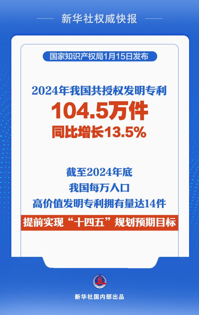 2024年我国共授权发明专利104.5万件,同比增长13.5%,全年注册商标478.1万件,同比增长9.1%;截至2024年底,我国每万人口高价值发明专利拥有量达14件,提前实现“十四五”规划预期目标,我国国内发明专利有效量达475.6万件,成为世界上首个突破400万件的国家……