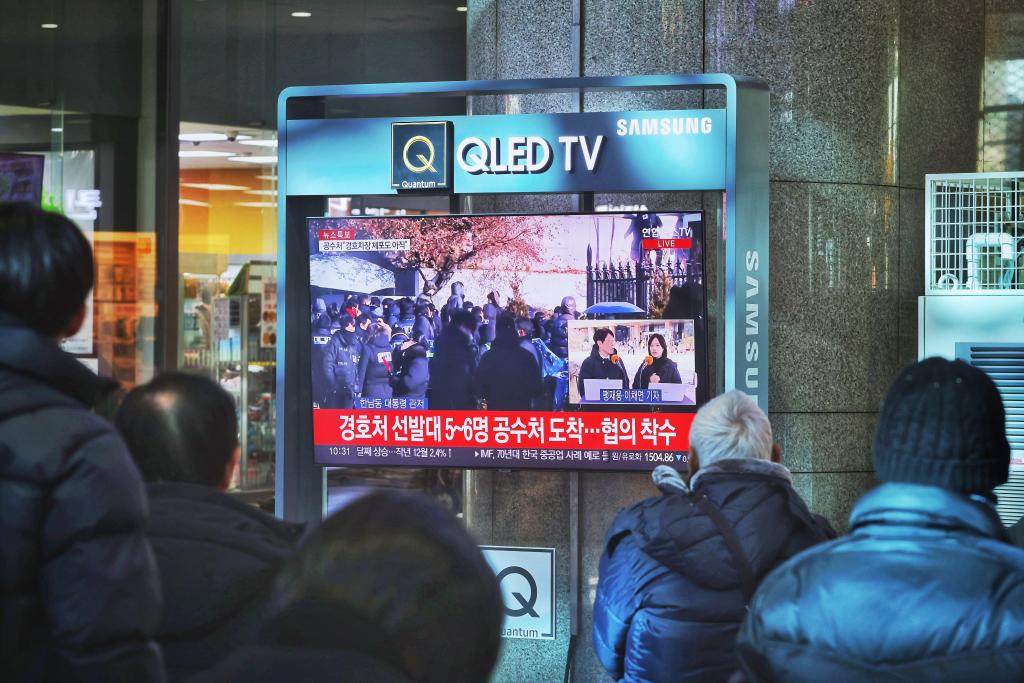 1月15日,民众在韩国首尔的龙山火车站观看尹锡悦被捕的电视直播。新华社发(朴晋泽摄)