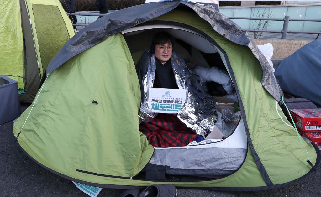 我在支持逮捕尹锡悦的集会现场看到,民众搭起了帐篷,帐篷边竖着标语牌“彻夜守候直到(尹锡悦)被抓”。集会主办者在现场设置一个大屏幕播放电视直播,民众们裹着羽绒服和保温毯席地而坐,很多人不时高呼口号要求立即逮捕尹锡悦。