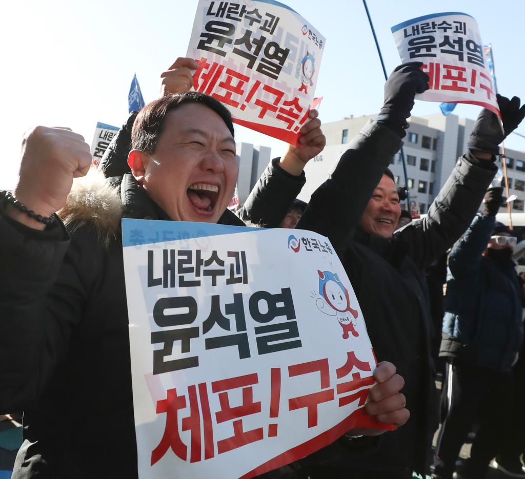 上午10时40分左右,韩国媒体发布快讯“已于10时33分逮捕尹锡悦”。消息传开后,在支持逮捕尹锡悦的集会现场,有人手舞足蹈庆祝,有人高喊“胜利了,国家终于开始走向正常了”。在反对逮捕尹锡悦的集会现场,此前誓言要守护总统的支持者们或高呼“非法”,或面露失望和不知所措,有情绪激动的民众对记者高声呵斥表达不满。