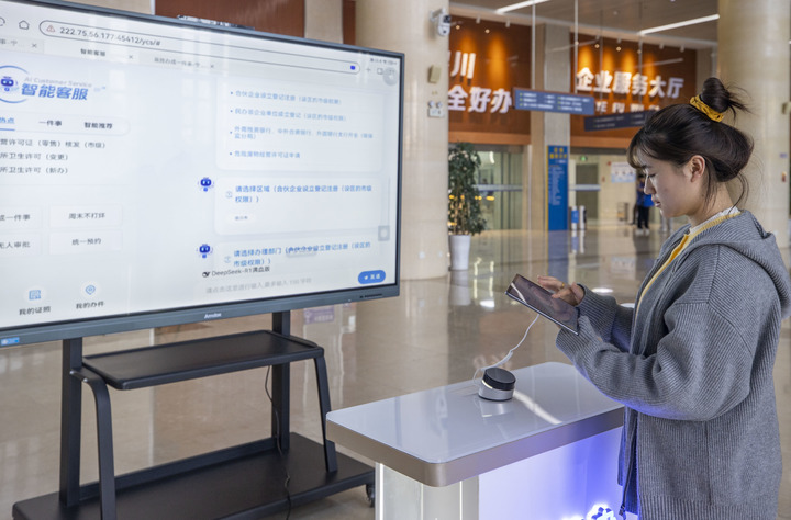 3月21日,办事人员在银川市审批服务管理局企业服务大厅使用智能客服查询信息。新华社记者 杨植森 摄