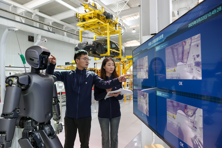 3月22日,在位于江苏无锡的天奇股份人形机器人数据采集实训基地,工程师在调试人形机器人。新华社发(朱吉鹏摄)