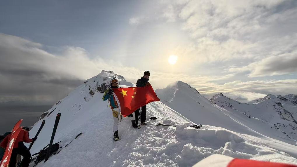 李铭(左)、王凯翔(右)在挪威罗弗敦群岛进行滑雪登山训练时展示五星红旗。图片来自李铭