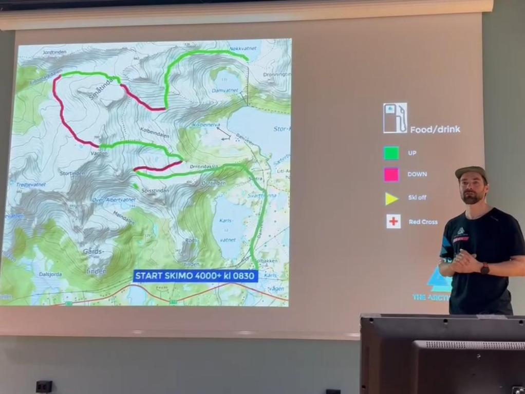 罗弗敦滑雪登山赛主办方在赛前准备会上介绍赛道地形图。截图自李铭提供的视频