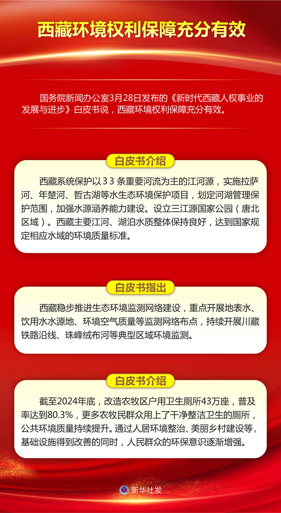 新华社拉萨3月28日电(记者唐健辉、潘一景)国务院新闻办公室28日发布的《新时代西藏人权事业的发展与进步》白皮书说,西藏环境权利保障充分有效。