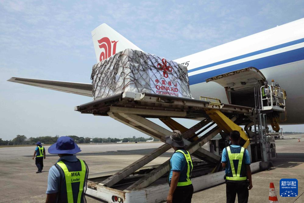 4月5日,中国政府向缅甸提供的第三批紧急人道主义地震救灾援助物资抵达缅甸仰光国际机场。 新华社发(亨曼摄)