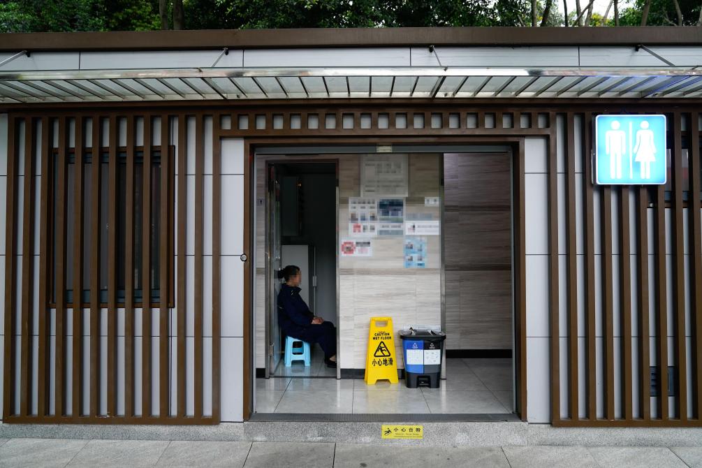 在四川某市一处公共厕所,保洁人员在休息室门口坐着休息(4月22日摄)。这个休息室空间虽小,但配有上下铺、长椅等设施,可供保洁人员休息使用。