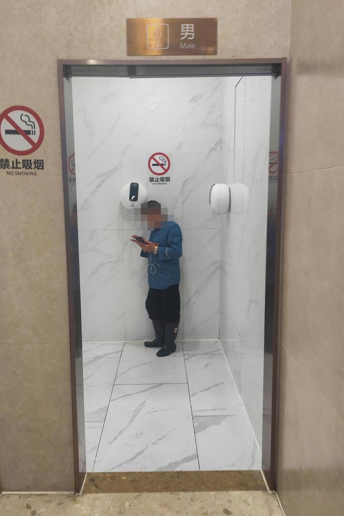 在广西某市一家商场内,卫生间里的一个小隔间既是保洁工具间,又是保洁人员休息室(4月17日摄)。