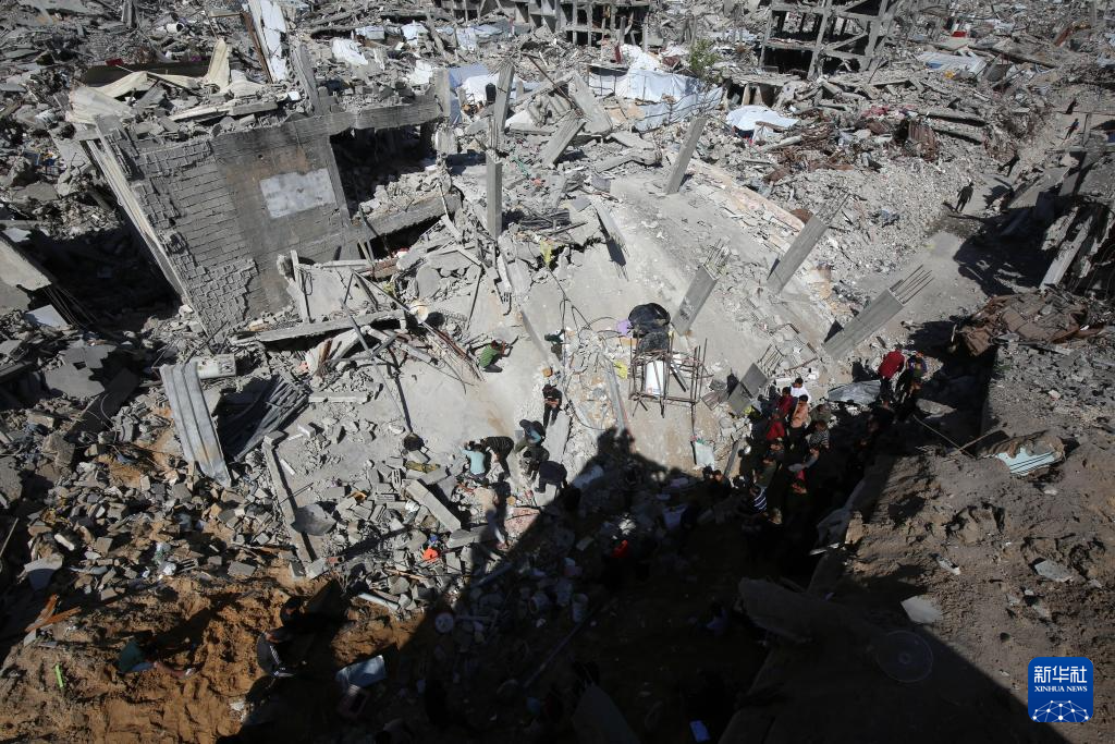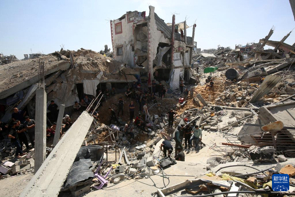 5月16日,在加沙地带北部杰巴利耶难民营,人们查看以军袭击后的建筑废墟。新华社发(里泽克·阿卜杜勒贾瓦德摄)