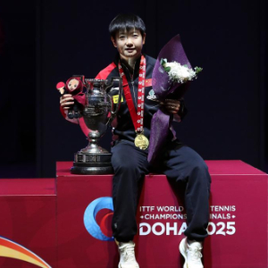 我曾在东京奥运会场边记录孙颖莎初登大赛的锐气,也在德班世乒赛见证她首次问鼎女单。如今在多哈,我又一次站在赛场边,看她从稚嫩走向成熟,从追赶者变成被追赶者,看她一次次挥拍、一次次跃起、一次次高高举起奖杯,把国乒的旗帜一次次稳稳插在最高领奖台上。