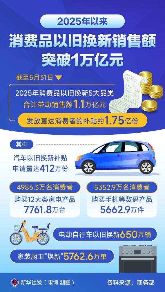 新华社北京6月1日电(记者谢希瑶)记者1日从商务部获悉,截至5月31日,2025年消费品以旧换新5大品类合计带动销售额1.1万亿元,发放直达消费者的补贴约1.75亿份。