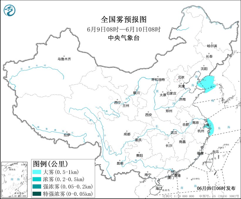 预计6月9日白天至夜间,渤海海峡、黄海北部海域、辽东半岛东部沿岸海域、成山头附近海域、长江口及杭州湾附近海域、舟山群岛附近海域、大连港、上海港、宁波港将有能见度不足1公里的大雾。