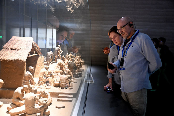 7月23日,上海合作组织媒体智库峰会与会嘉宾在郑州商都遗址博物院参观。新华社记者 朱祥 摄