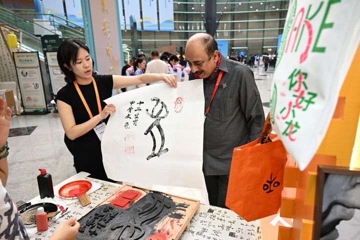 7月25日,与会代表在峰会会场欣赏拓印。新华社记者 郝源 摄