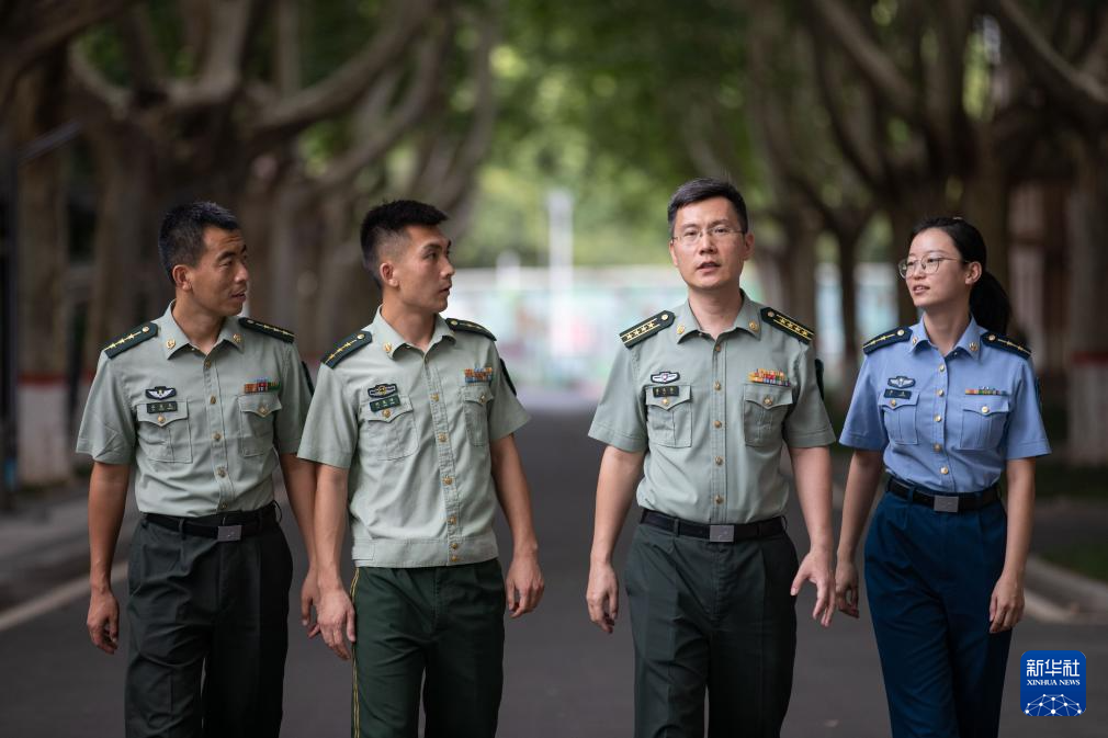 国防大学政治学院西安校区教授傅达林(右二)在校园中和学员交流(7月24日摄)。新华社发(聂瑞明 摄)