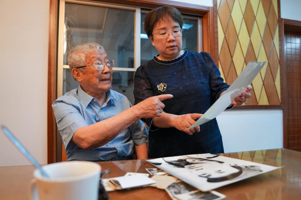 2025年7月11日,王生(左)与女儿王远在家里翻看老照片。