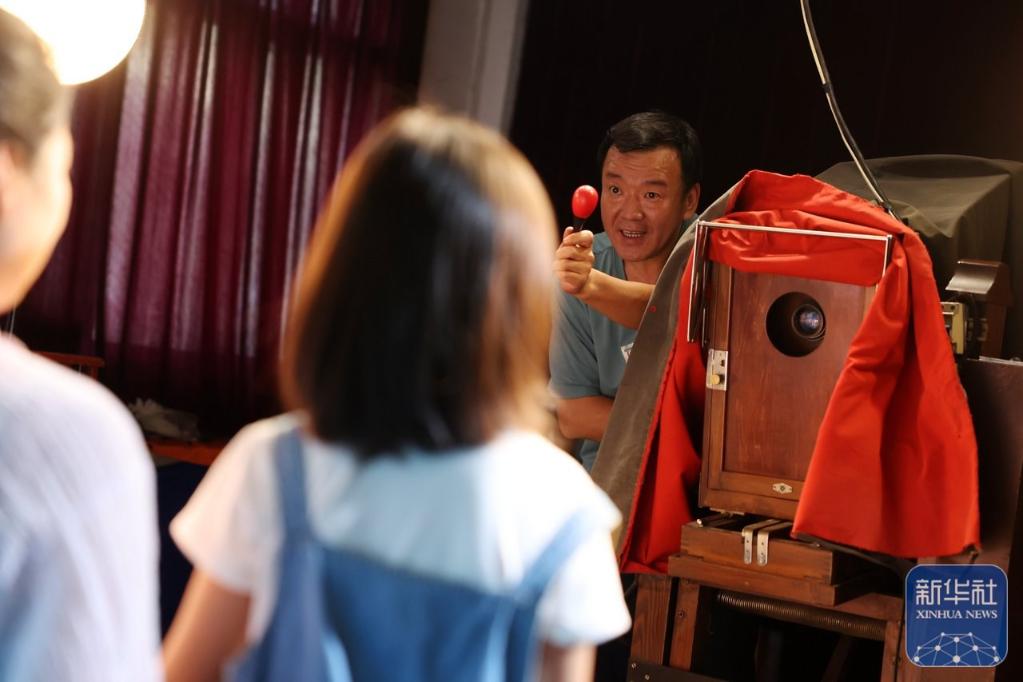 2025年7月29日,魏伟(右一)在阿干照相馆里为几位专门赶来的西安游客拍摄全家福。新华社记者 陈斌 摄