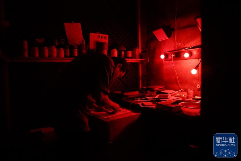 2025年7月29日,魏伟在阿干照相馆的暗房里冲洗照片。新华社记者 陈斌 摄