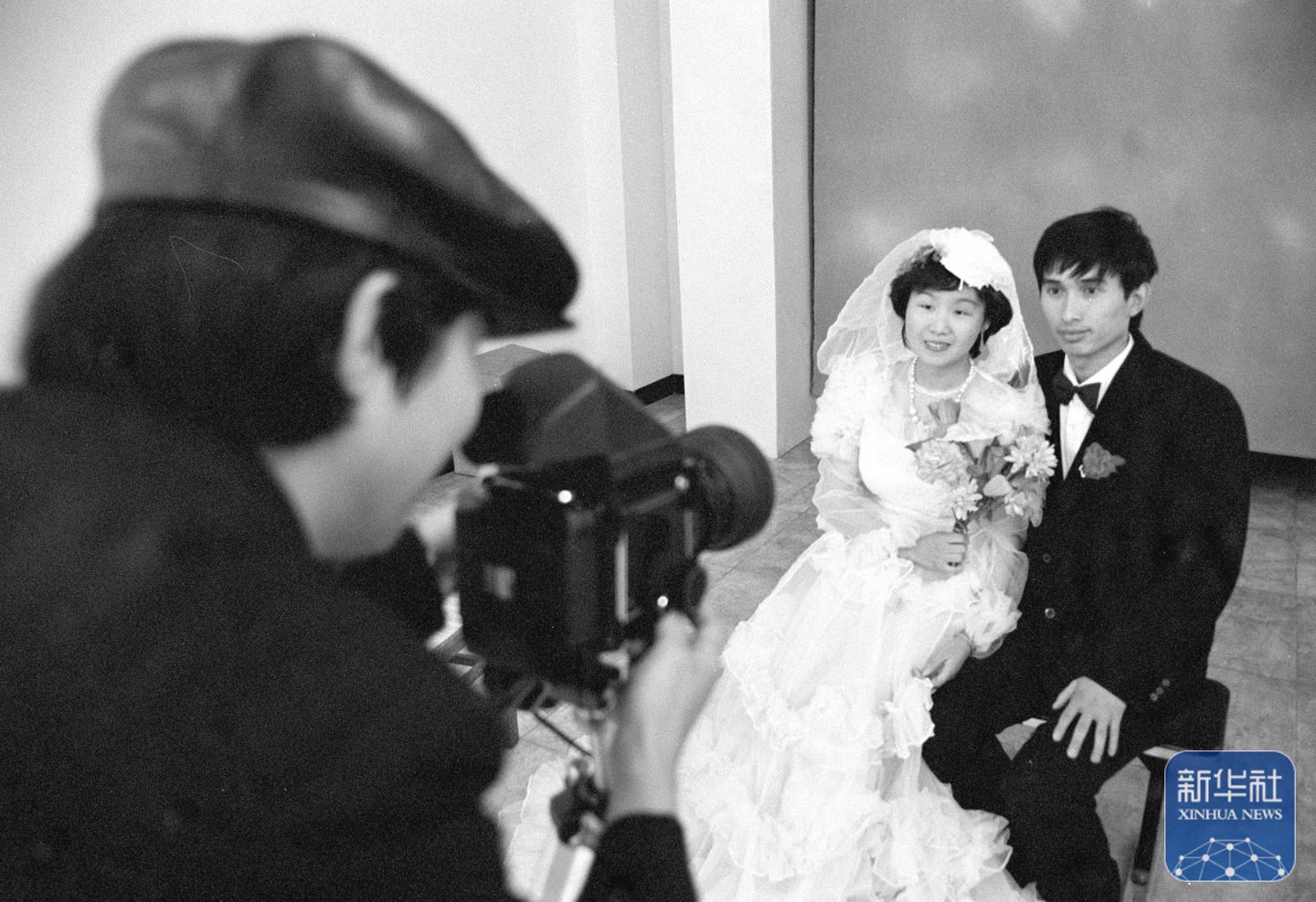 1988年,一对新人在北京中国照相馆拍结婚照。新华社发