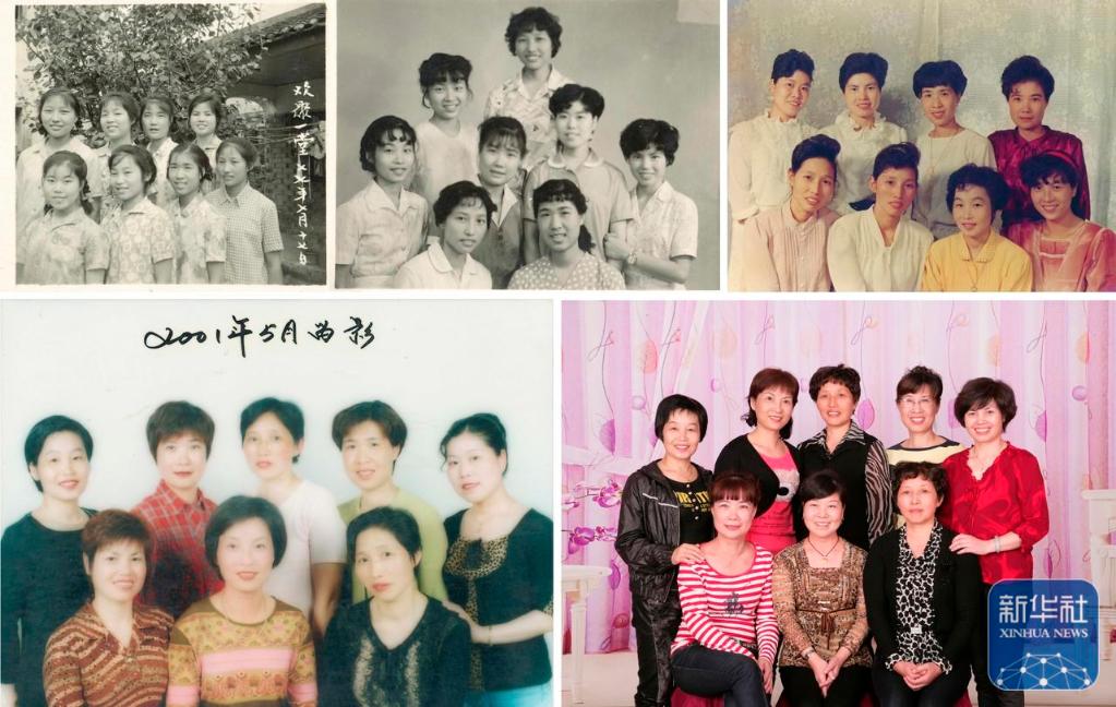 浙江省平阳县的蔡桂莉、黄笑和、黄笑平、陈小玲、李爱月、姜小飞、黄丽丽、金锦丽在1977年至2011年间的合影(拼版照片,上左:1977年、上中:1981年、上右:1991年、下左:2001年、下右:2011年)。她们是初中同学,1977年7月17日,她们在平阳县昆阳镇一家照相馆拍了张合影,并相约每年都拍一张合影作为友谊的纪念。