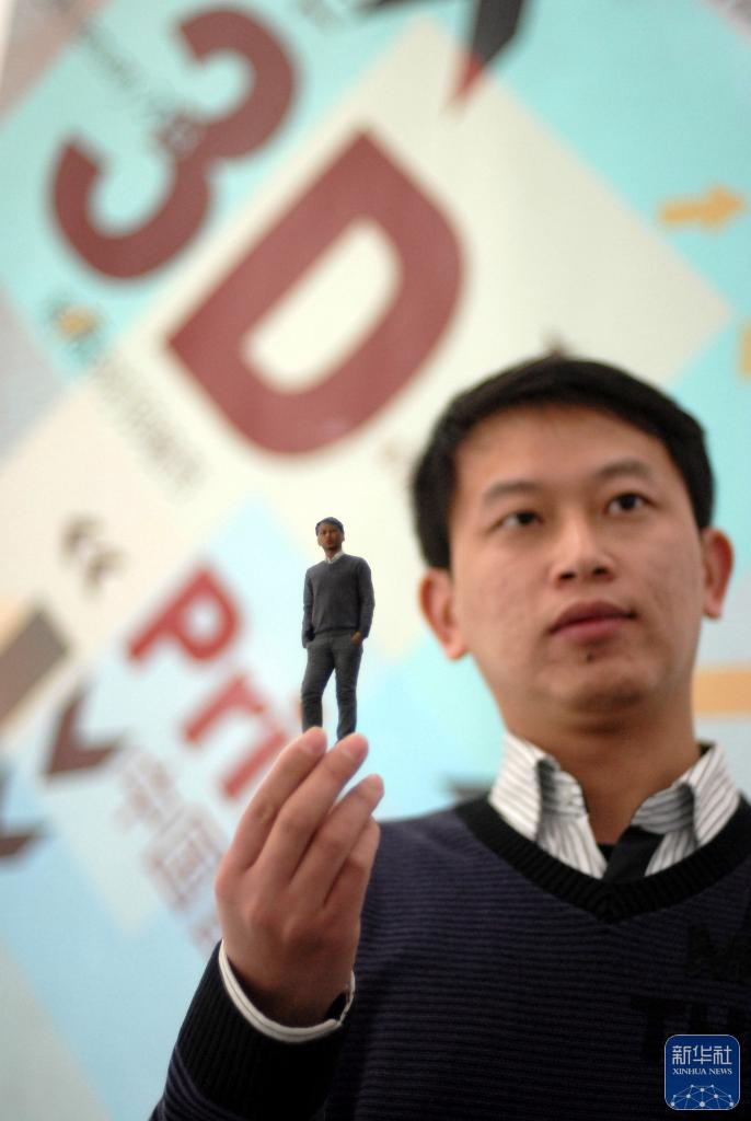 2013年1月17日,在北京工业设计创意产业基地,一名3D打印照相体验馆的工作人员展示已经制作好的3D人物模型。新华社发(王振 摄)